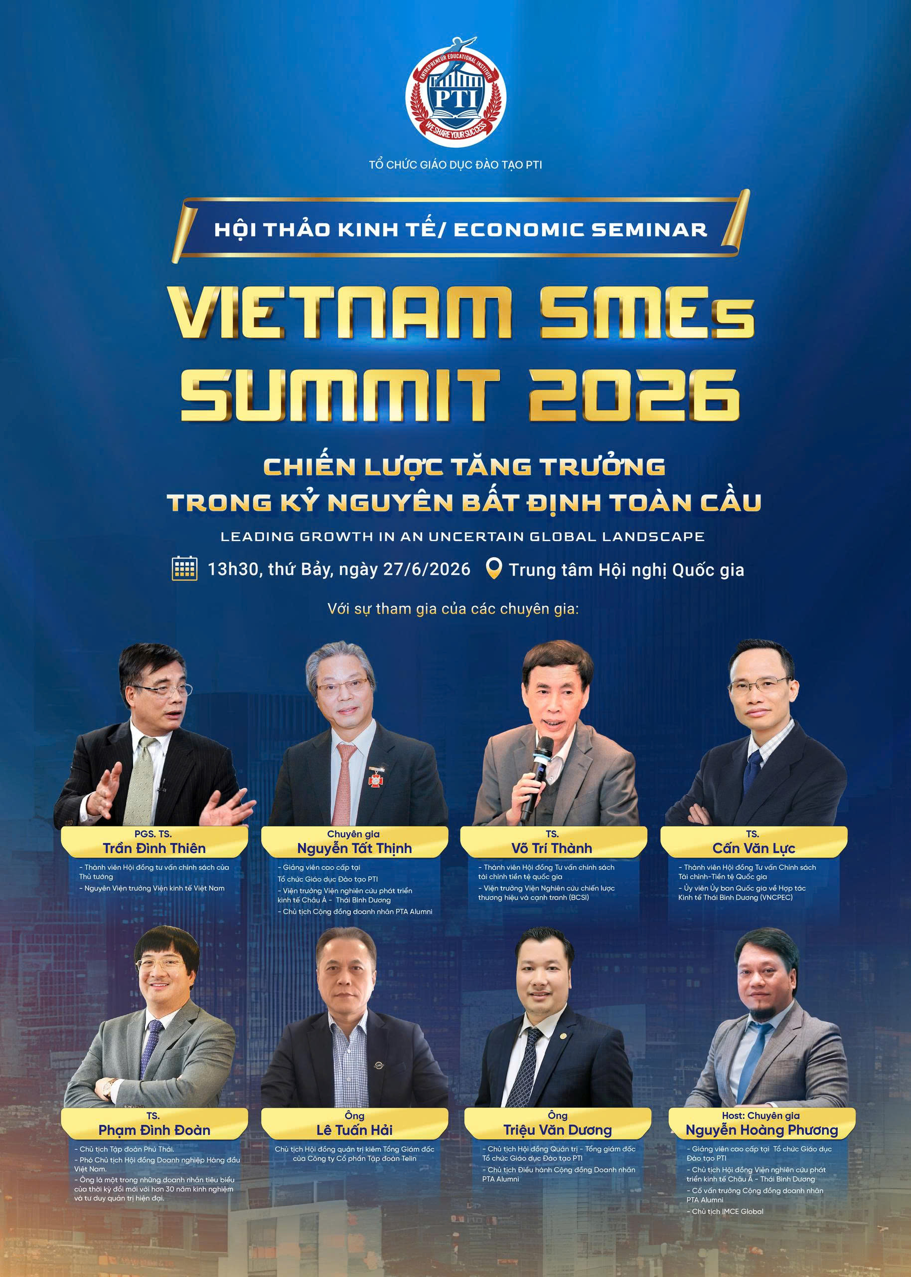 Với sứ mệnh đồng hành cùng cộng đồng doanh nhân Việt Nam nâng cao năng lực quản trị và tư duy chiến lược, PTI trân trọng tổ chức Hội thảo Kinh tế: "VIETNAM SMEs SUMMIT 2026 - Chiến lược tăng trưởng trong kỷ nguyên bất định toàn cầu". Đây là diễn đàn cấp cao quy tụ các chuyên gia kinh tế, nhà hoạch định chính sách cùng hàng trăm CEO và lãnh đạo doanh nghiệp trên toàn quốc, nhằm cùng nhau thảo luận những vấn đề mang tính sống còn: