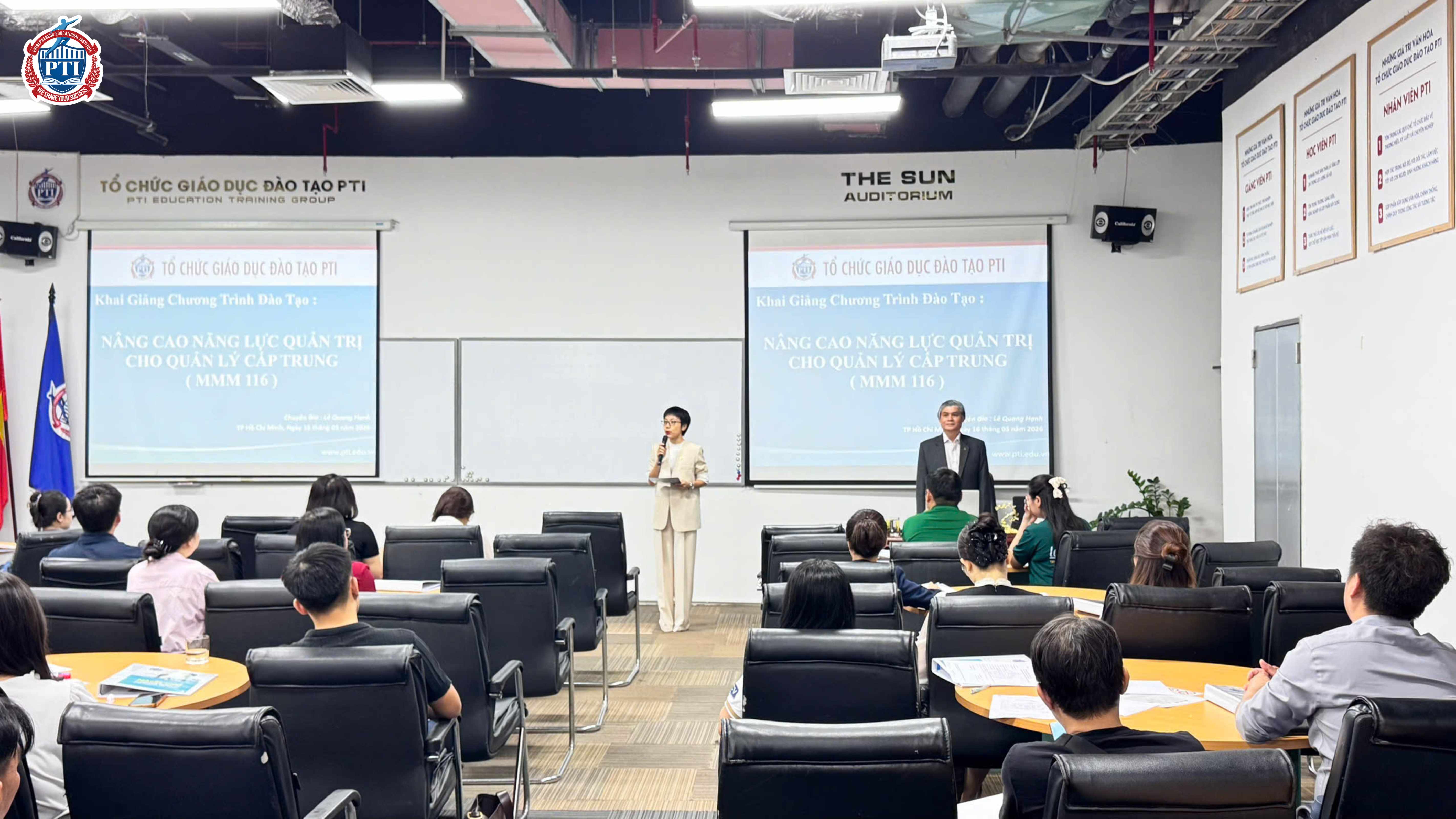 Ngày 16/03/2026, tại phòng học The Sun – Quận 11, PTI đã tổ chức khai giảng khóa học “MMM – Năng lực quản trị cho quản lý cấp trung” khóa 116, thu hút sự tham gia của nhiều học viên là các quản lý cấp trung đến từ nhiều doanh nghiệp.